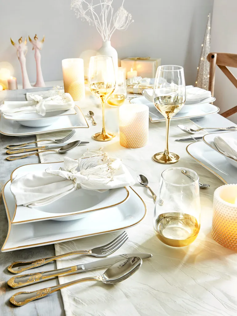 Der feine goldfarbeneNachbildung in Teilflächen Optik passt perfekt zu dem trendigen Themenkreis „Festliche Tafel & Industrial Chic“.