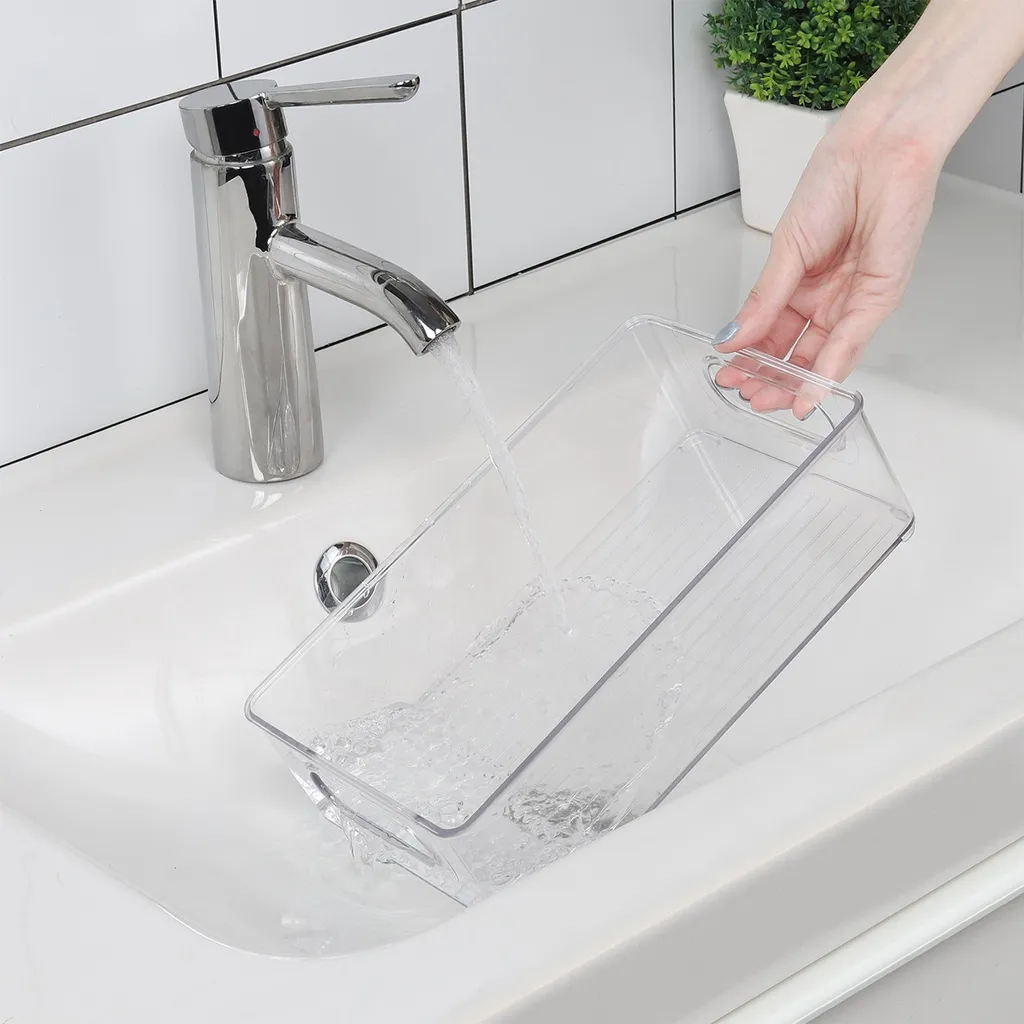 Dies ist ein Organisationsset für die Küche, bestehend aus 6x transparenten Aufbewahrungsboxen in den Maßen 25,5 x 15 x 7 cm. Sie sollen dabei helfen mehr Ordnung und Platz im Kühlschrank zu schaffen. Die Behältnisse sind jedoch flexibel einsetzbar und können auch in anderen Bereichen des Haushalts Verwendung finden. Die Organizer können auch übereinander gestapelt werden, um noch platzeffizienter zu arbeiten. Die Boxen werden aus hochwertigem PET-Material gefertigt, welches langlebig und BPA-frei ist. HINWEIS: Die Boxen dürfen nicht in der Spülmaschine gereinigt werden! Sie müssen mit warmen Wasser (bis max. 50 °C) und Spülmittel abgewaschen werden.