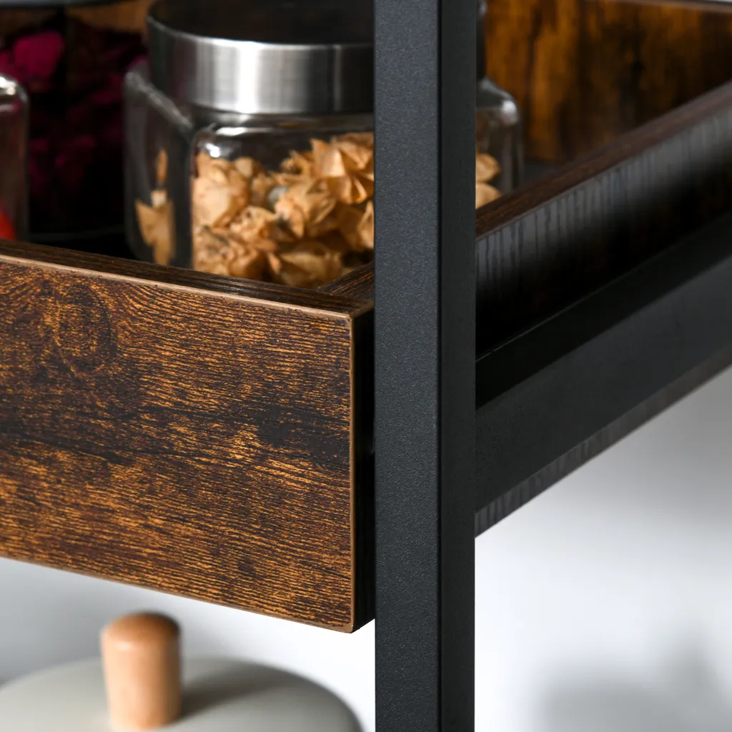 Mit rustikalem braunem Holzfurnier und einem Metallrahmen verleiht dieser speziell entworfene Küchenwagen Ihrer Küche, Ihrem Esszimmer oder Ihrem Wohnzimmer einen Hauch von industriellem Stil.