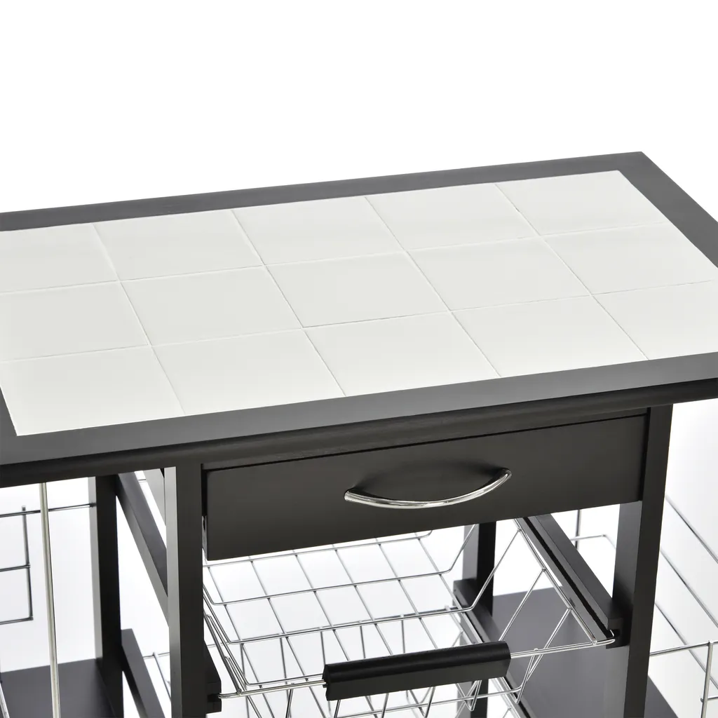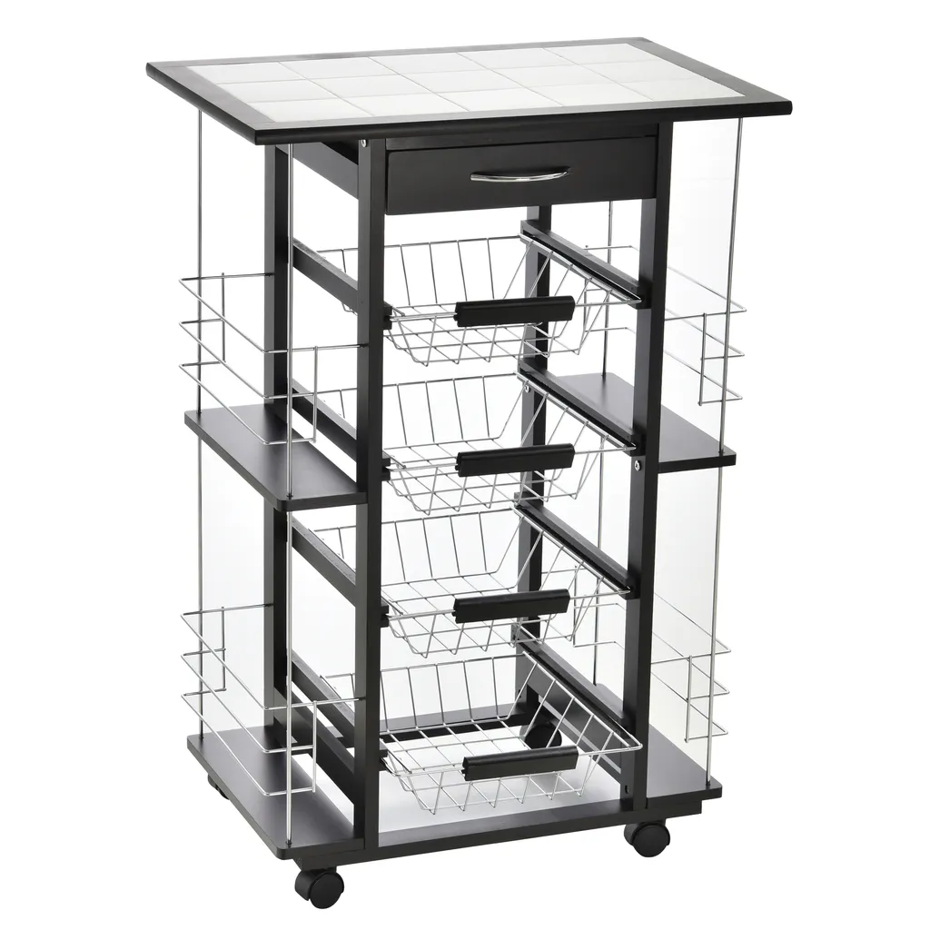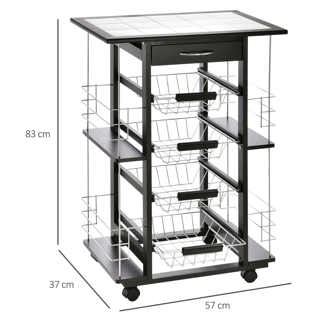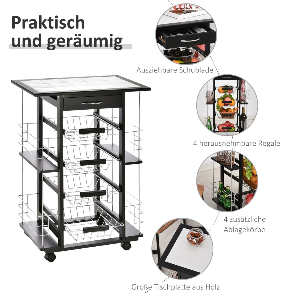 Dieser vierstufige rollende Küchenwagen besteht aus Edelstahlkörben, einem Kiefernrahmen und einem Keramikdeckel. Er ist jahrelang haltbar und sehr leicht mit nur einem feuchten Tuch zu reinigen